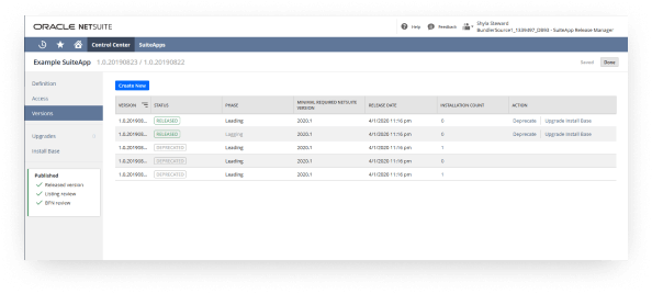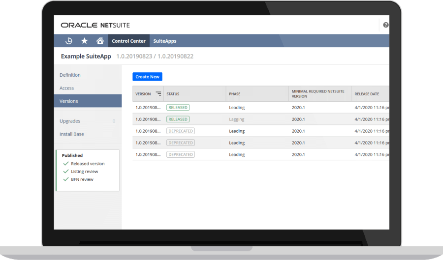 SuiteCloud provides a centralised environment to manage the distribution of applications and packaged customisations to accounts. ISVs can also use the Control Centre to publish and manage availability of their products to end customers from the SuiteApp marketplace and SuiteApp.com(opens in new tab).