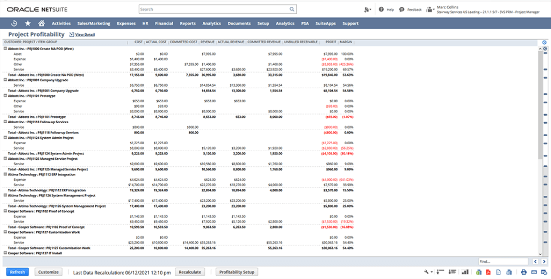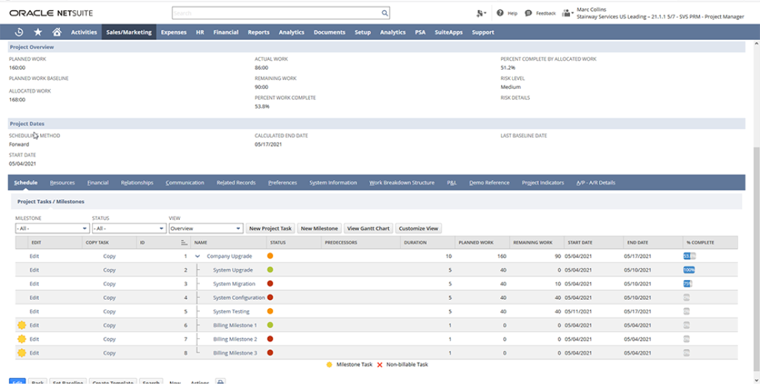 NetSuite’s native reporting capabilities enable companies to track performance and project health. Report on employee utilisation and customer and project profitability using data based on actual posting revenue and expense transactions. Track current backlogs to get a quick overview of what jobs and tasks remain open.