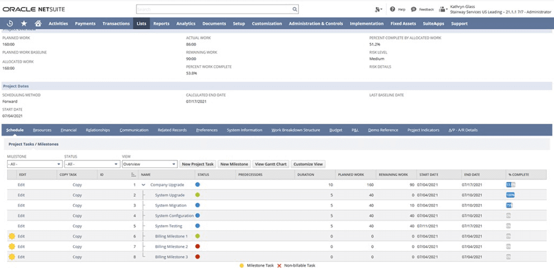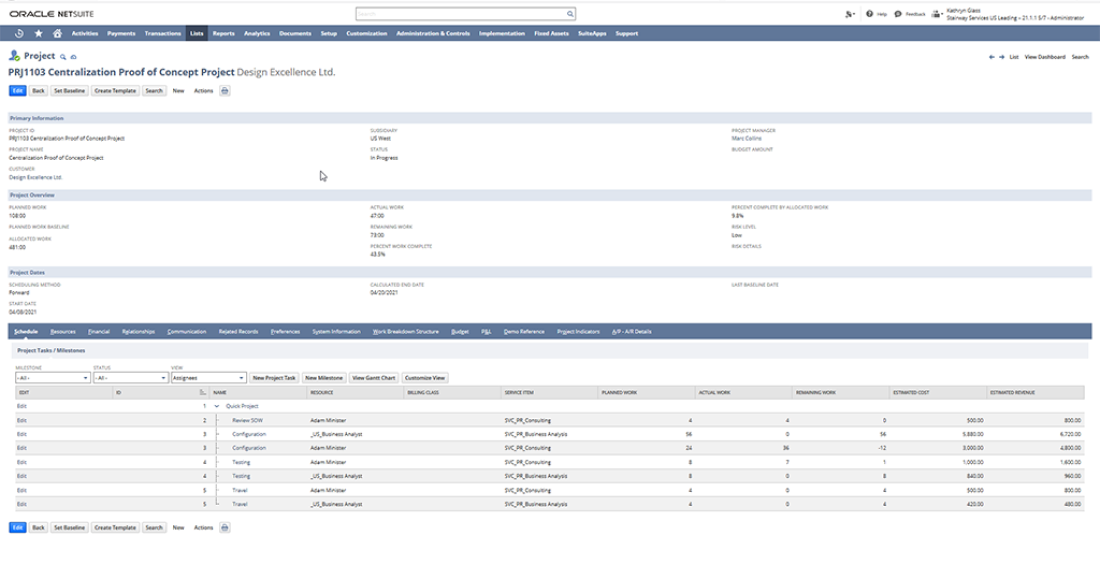 NetSuite project management seamlessly integrates with NetSuite accounting, allowing you to monitor and manage revenues, expenses, billing and profitability over the lifetime of a project.